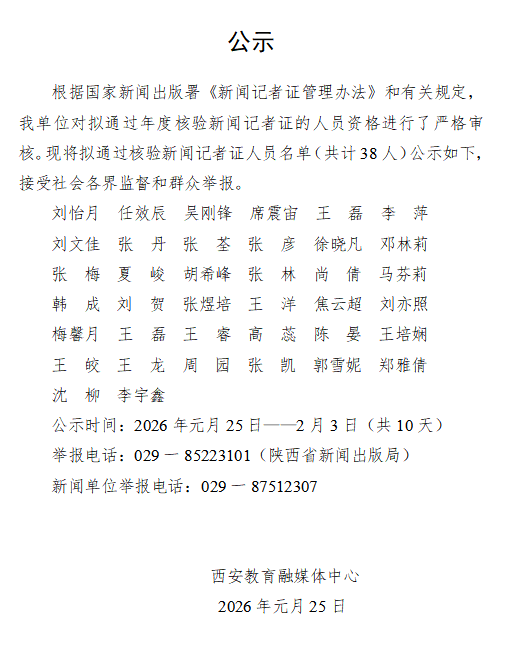 西安教育电视台申领新闻记者证人员名单公示(4人...